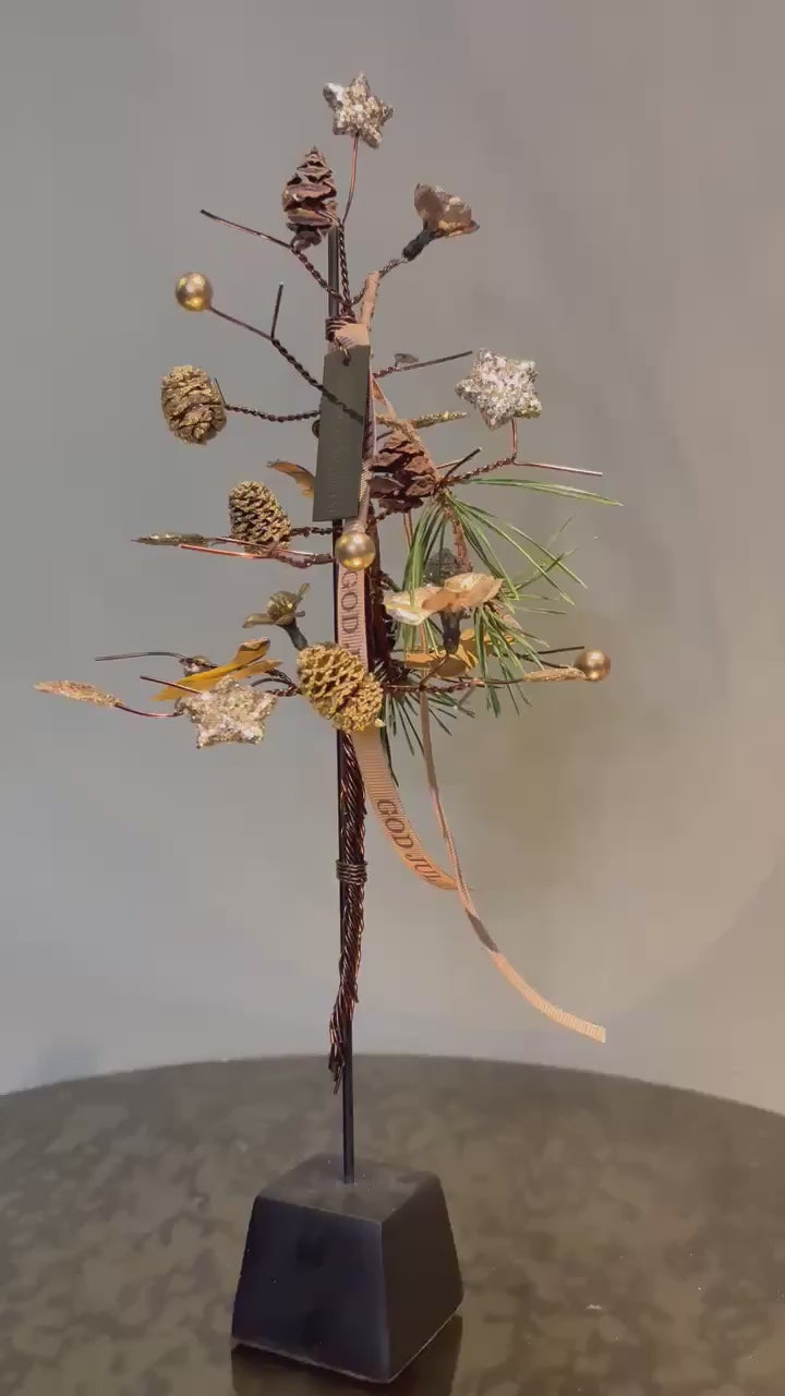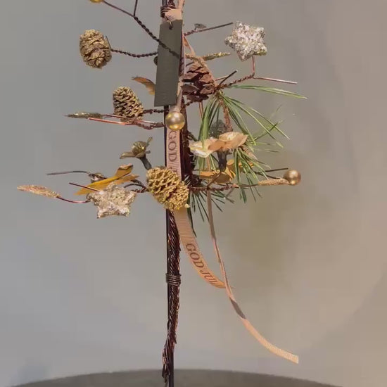 Håndlavet juletræ med kogler, "flyvere", forgyldte ellekolger og andre fine små detaljer. Sat på fod på et sort designstativ.