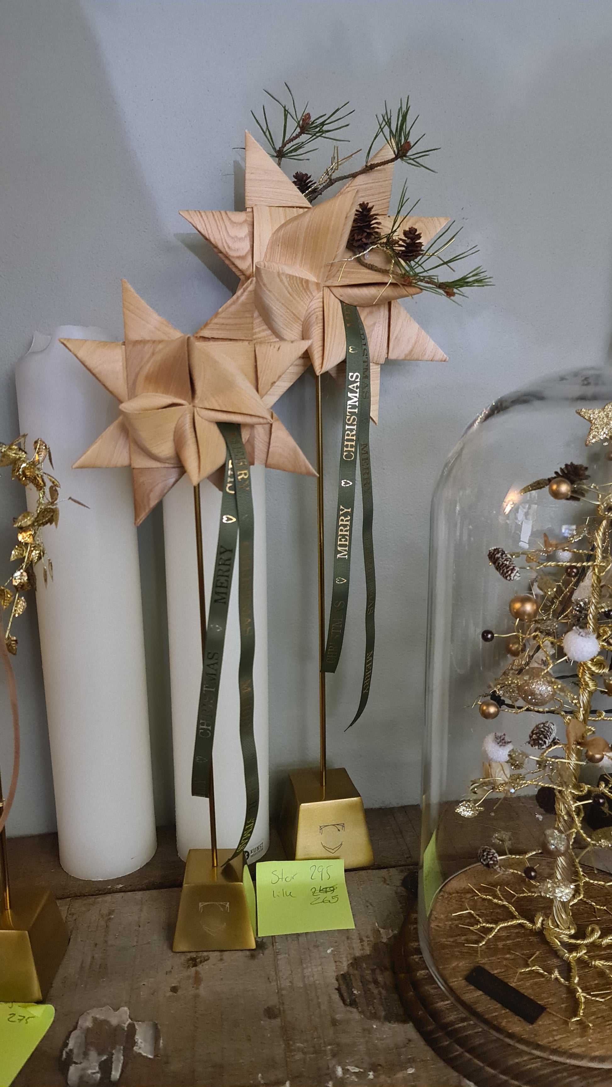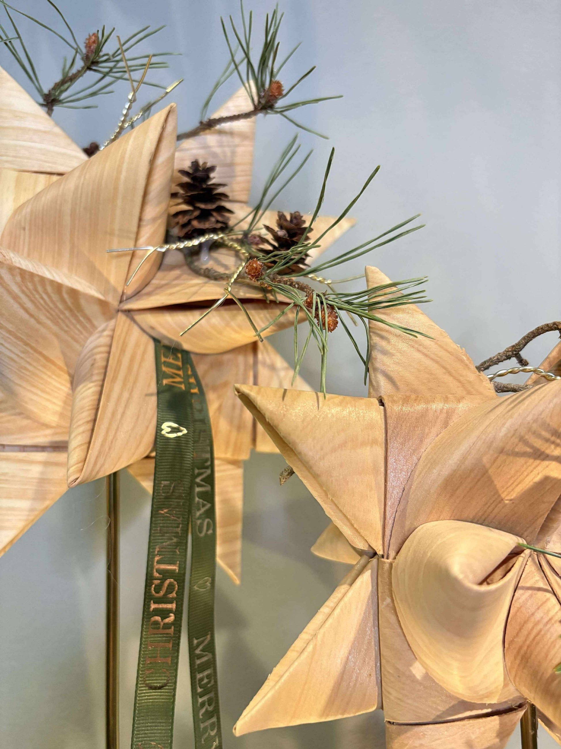 Flettede finér stjerner med enkelt pynt i form af fyr, kogler og bånd